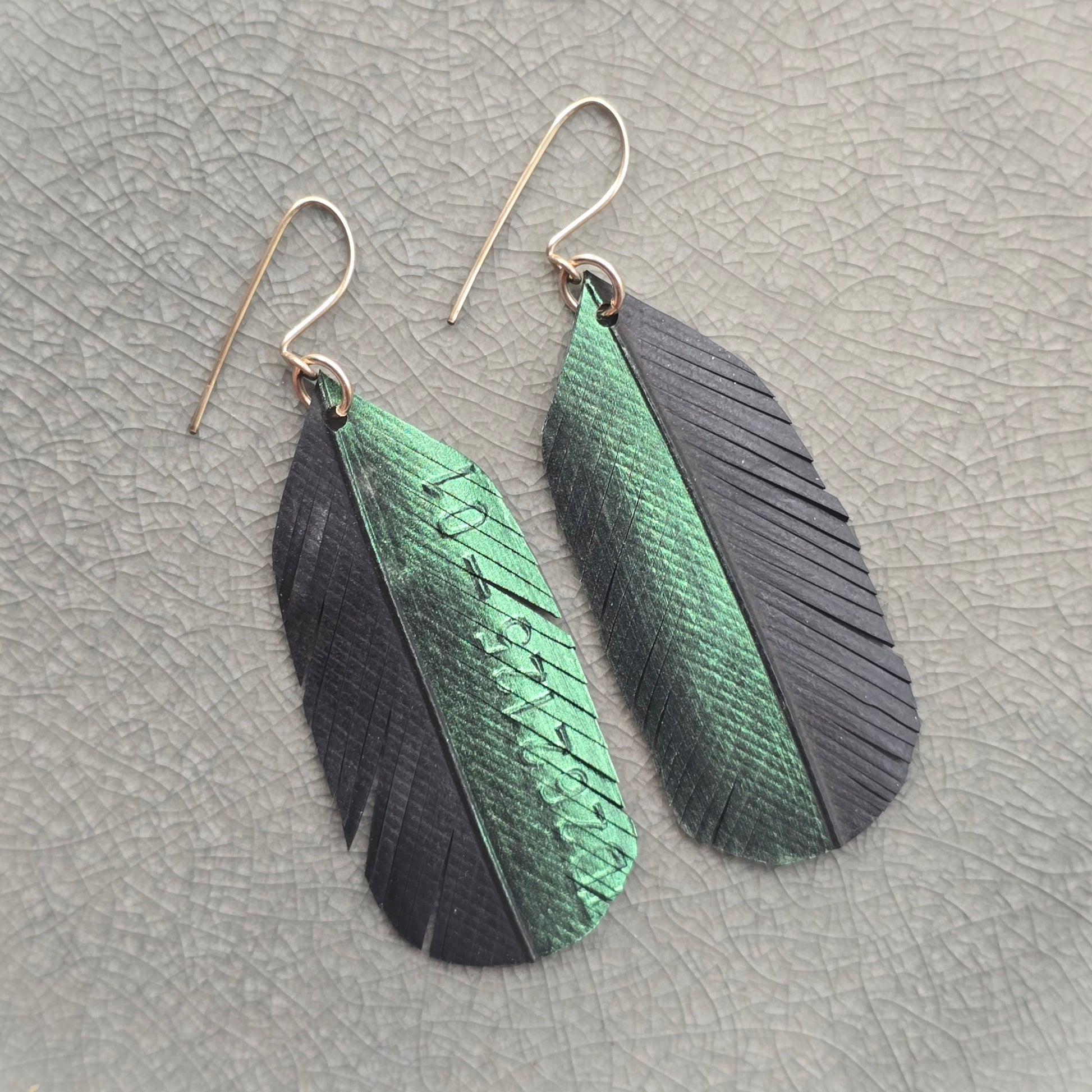 These clever feather-like designs are made from up-cycled bicycle inner tubes with sterling silver hooks, blending sustainability with style. It’s a beautiful use of something that usually ends up in the landfill.