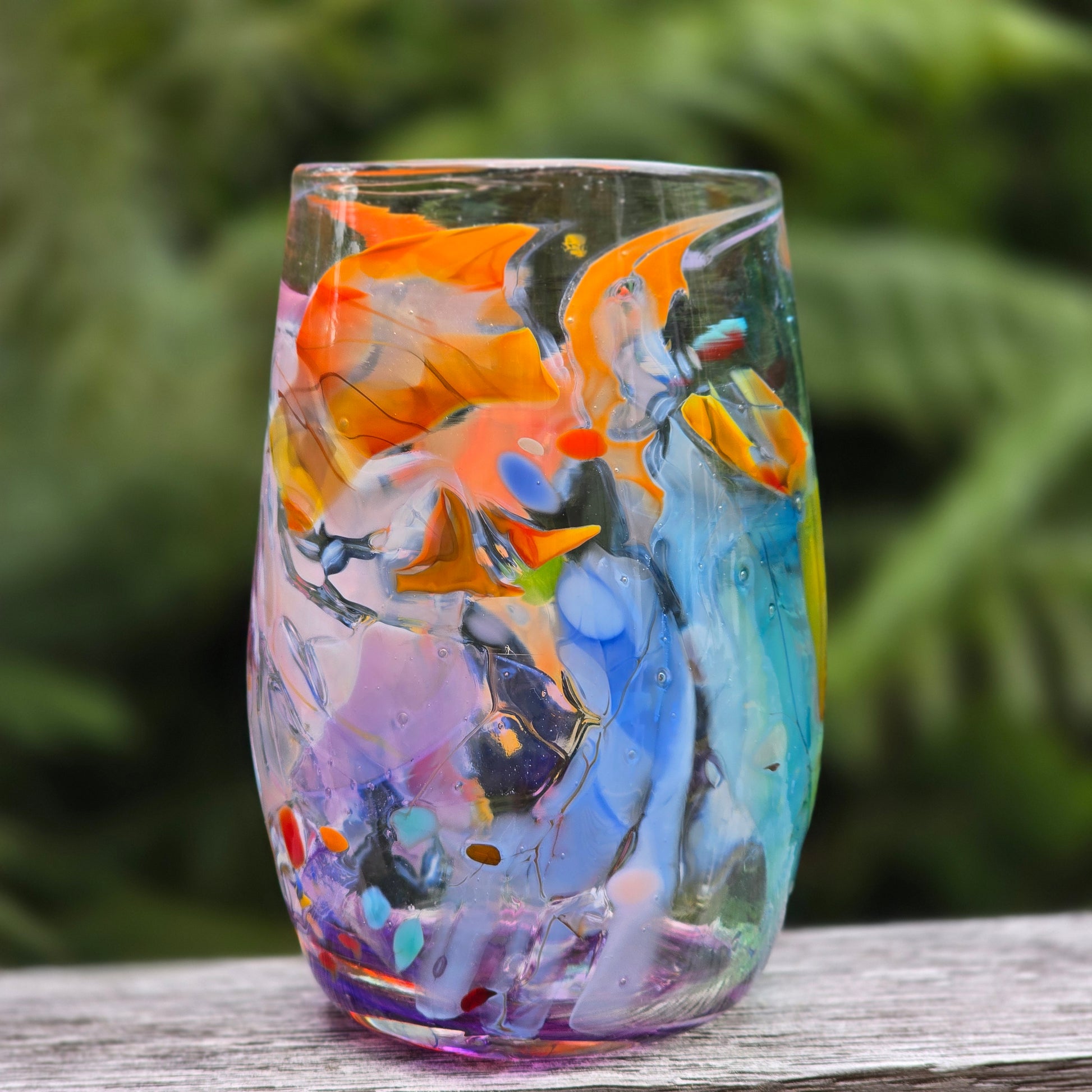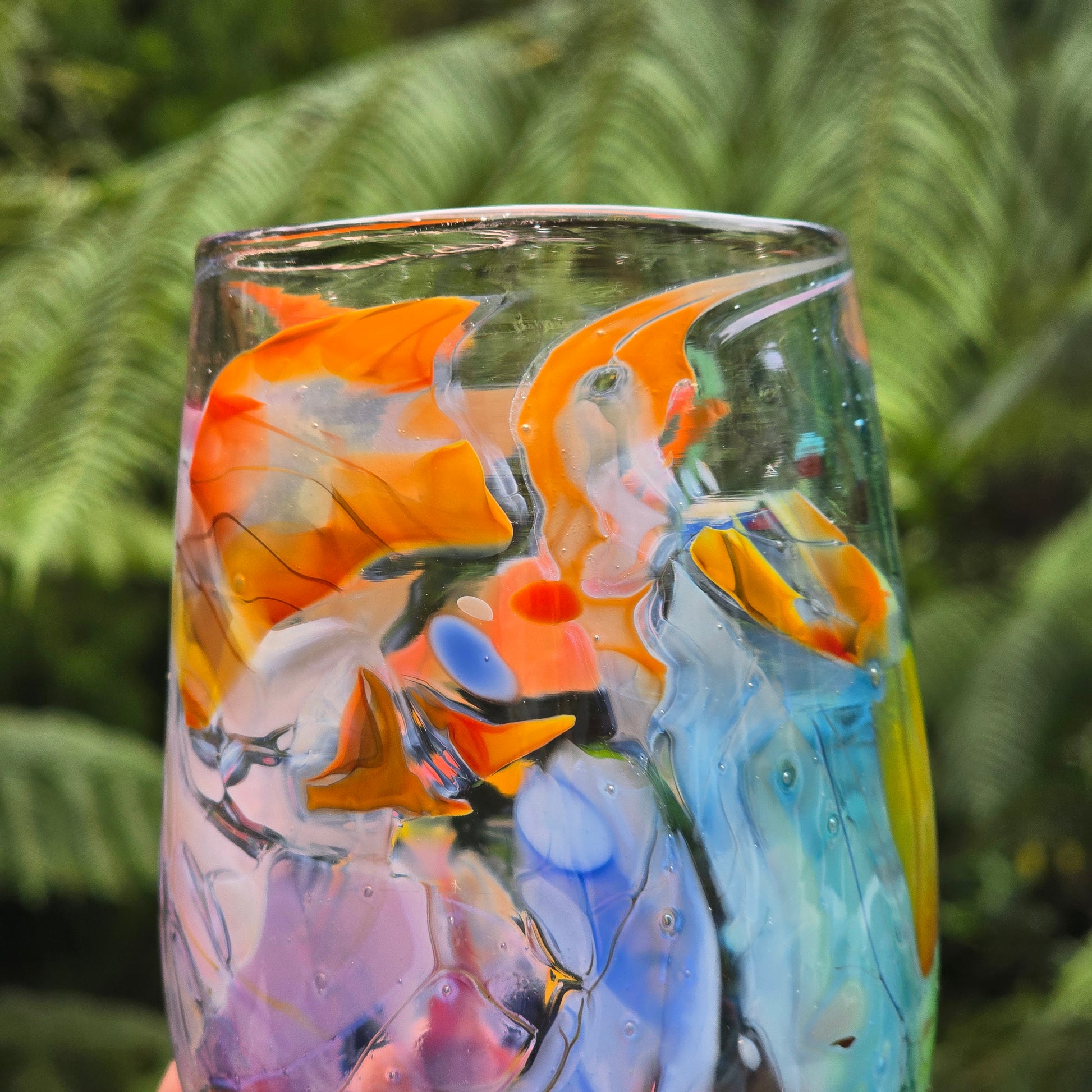 Gorgeous multicoloured tumbler created by the very talented Glassblower Keith Grinter. Super gorgeous tumble, the colours within the glass exhibit motion. Can be used as a small vase, vessel or beautiful glass ornament.