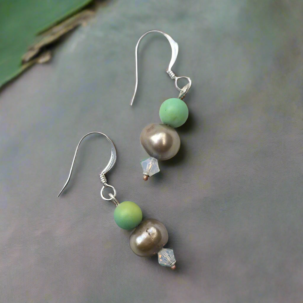 This lovely pair of earrings have been hand made in New Zealand, from of a selection of Faceted Opalite, Green Jasper and Pearl beads.