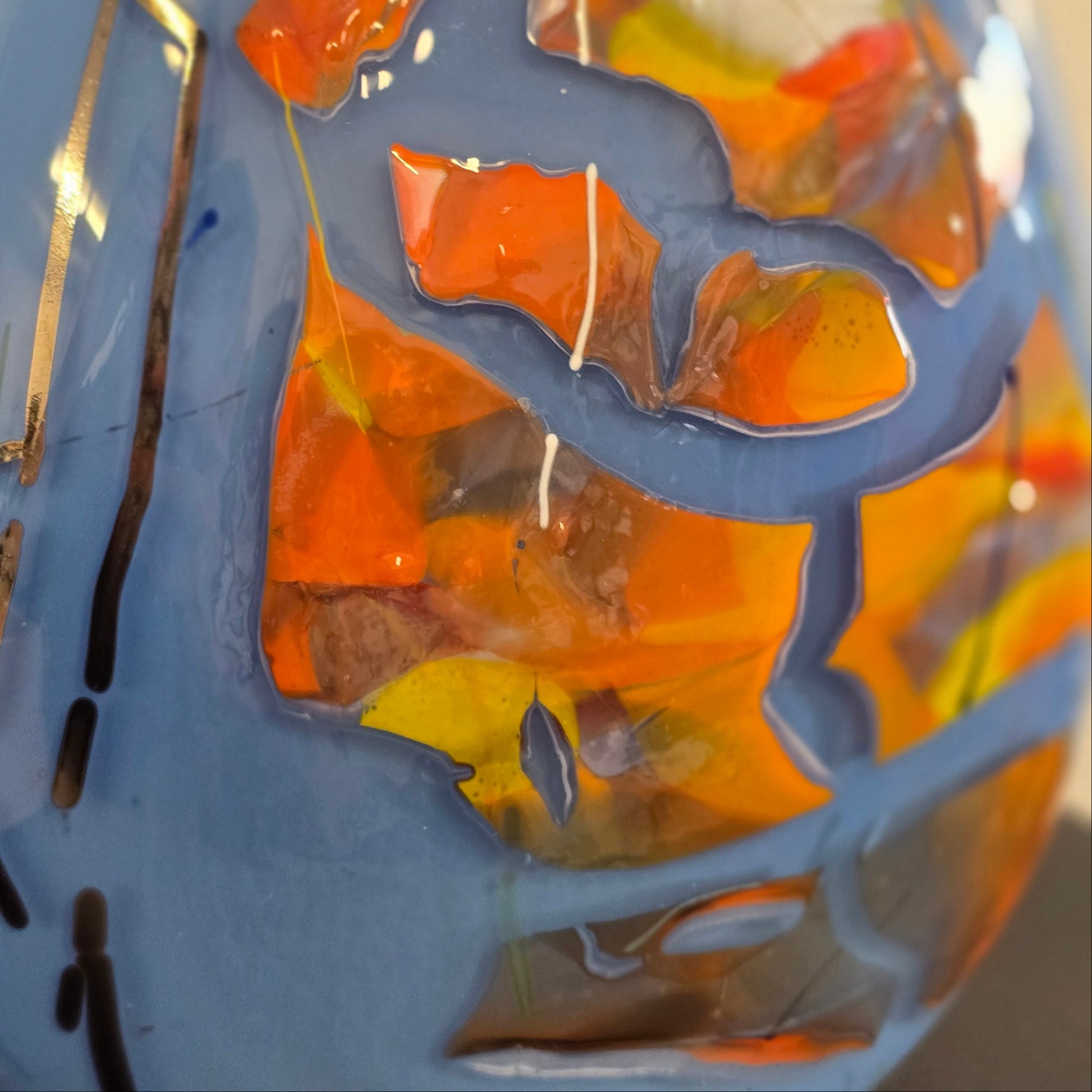 This gorgeous blue vase features shards of orange and yellow tones.