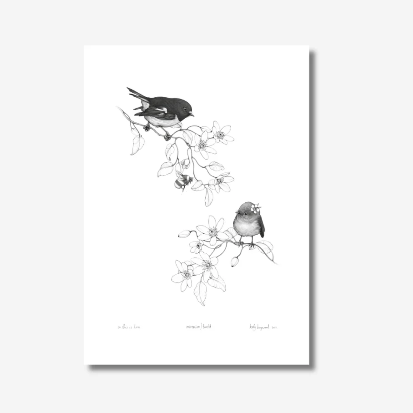 Art work by Northland based artist, Katy Hayward. This drawing was inspired by her aroha/love for going on beautiful bush walks with her little family, and the joy of both hearing and spying these adorable little forest pandas! The puawānanga/clematis paniculata are also one of Katy’s favourite native flowers and she get’s so much enjoyment seeing the brightness of them in amongst the trees as they open up in springtime!